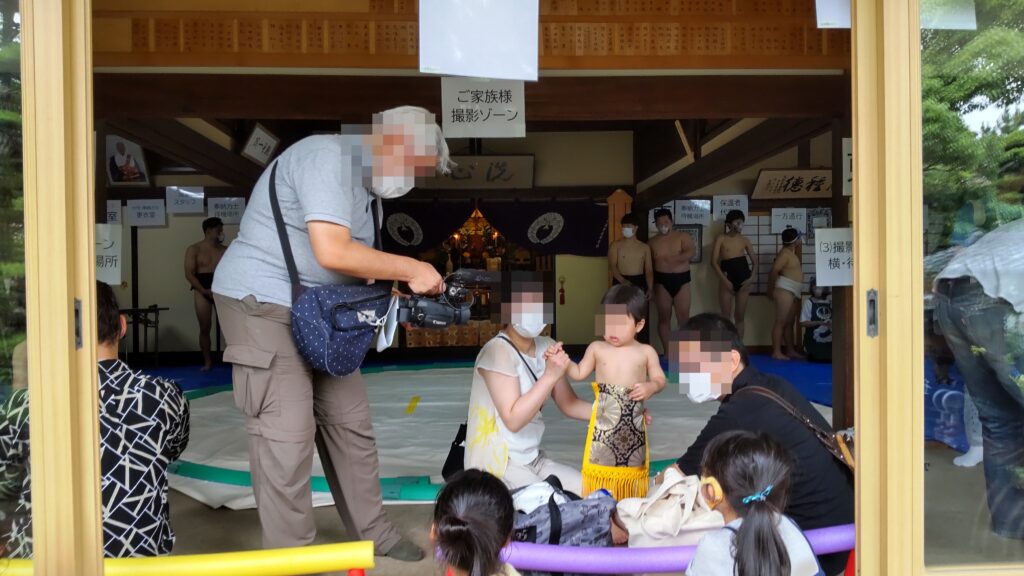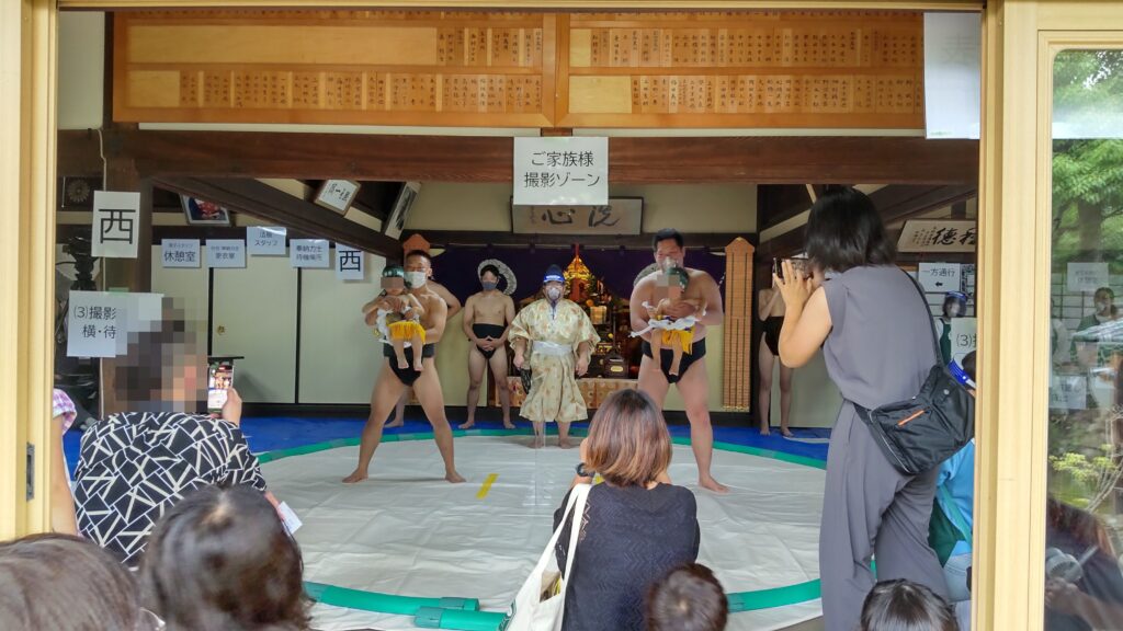 「泣き相撲奉納」とは、子供を授かったことに感謝し、丈夫な体で成長することを祈願する伝統行儀です。神聖な土俵に素足をつけることで、病気や不運を払うとも伝えられています。