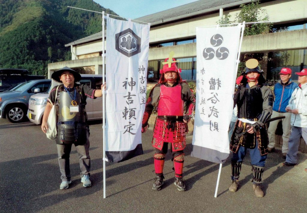 この後が武者行列の予定だったのですが、下山して行列に加わる準備時間が全くなく、ダッシュで下城し、車で集会場に到着、休んで身なりを直す暇もなく、そのまま行列ということになりました・・・・・。