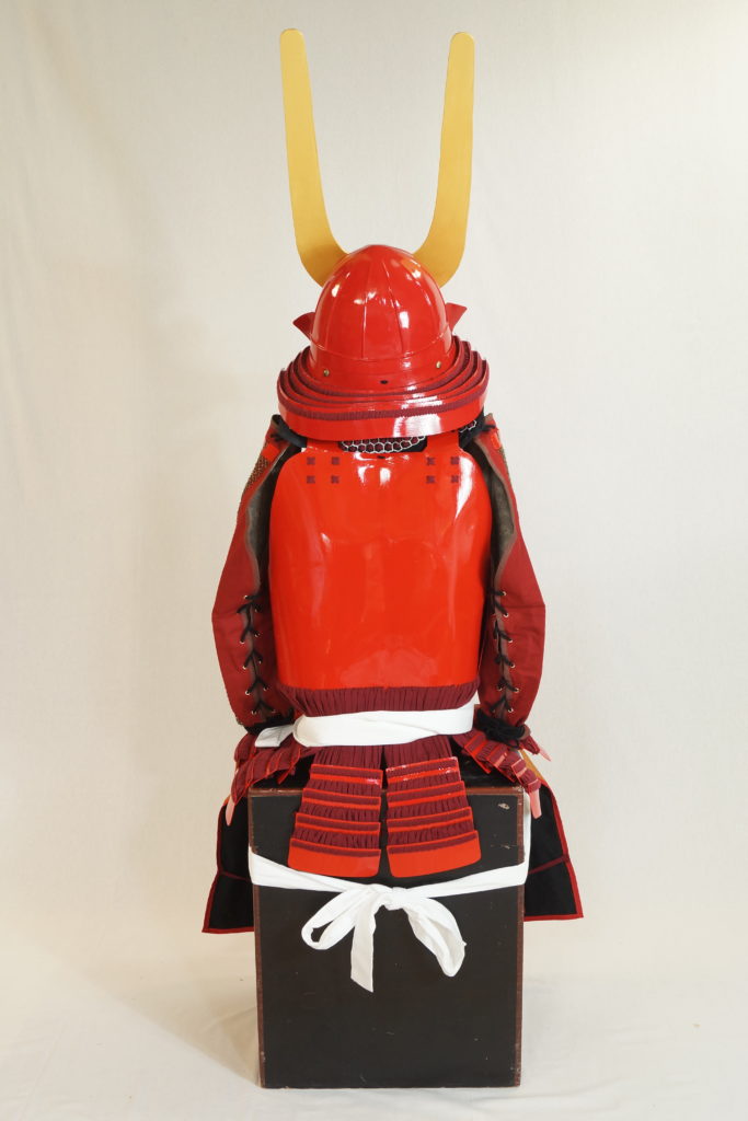 全体の色は朱色(赤色)。兜は突盃形(とっぱいなり)に四段毛引きの錣(しころ)。大天衝の前立て。胴は仏胴、胸に昇り梯子を金色で。草摺りは七間四段の毛引き。佩楯(はいだて)は板佩楯。篠の脛当。籠手は瓢箪(に似せた(笑))札ものを鎖で。袖は無しにしました。面具はおまけで。あと、毛皮の羽織もおまけで。
