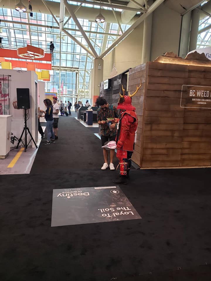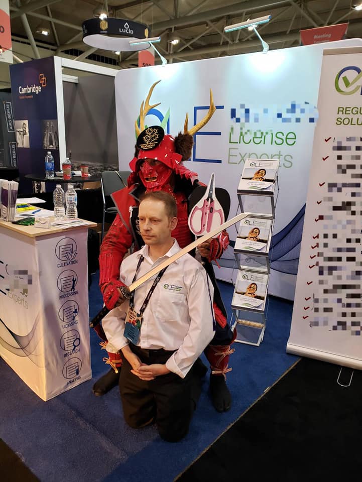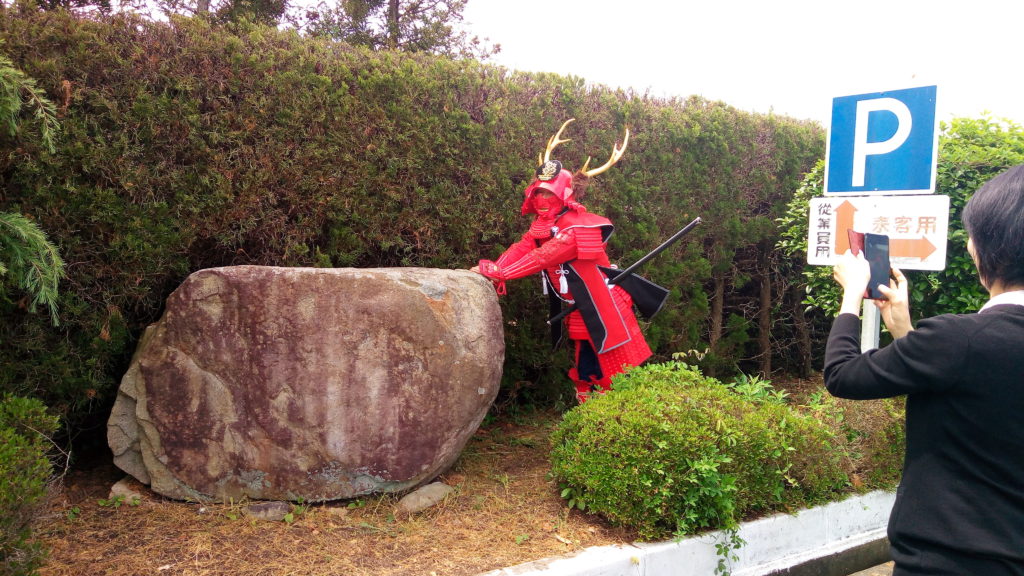 展示会の会場で甲冑姿の人は一人だけ。来場されたお客様からは「Crazy!! , Loving you!!」などと声をかけられ、ハリウッドのスター並みの写真撮影という大人気振りだったとのこと。