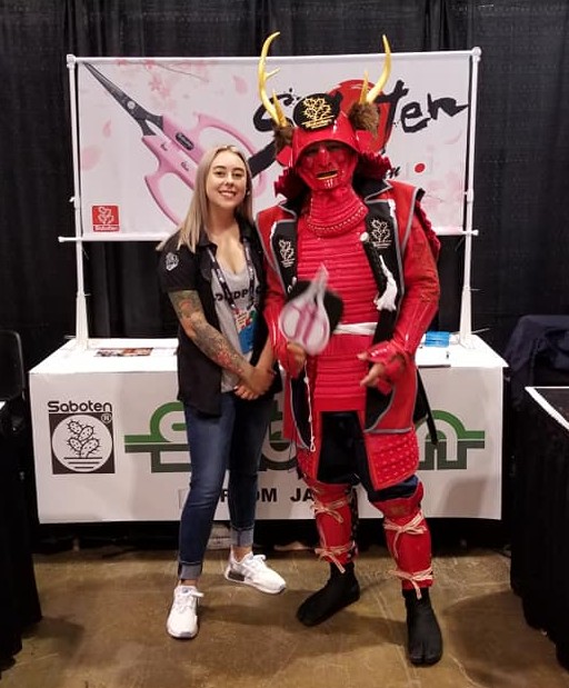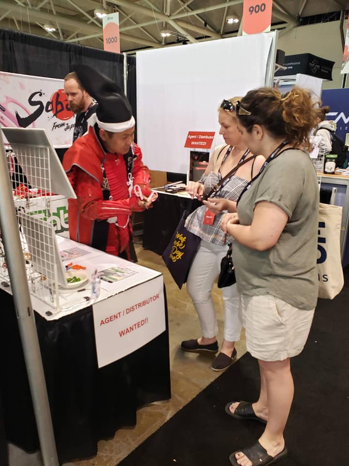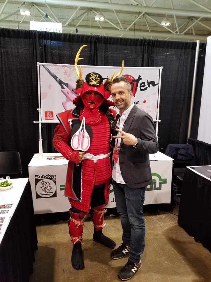 (株)サボテン様は、農業・園芸用の刃物を製造されていらっしゃる企業です。このたび、海外での市場開拓を強化される一環で、海外での展示会にご出店。その際に、JAPANをアピールするために、そして自社商品を”強烈に”PRされる目的に甲冑をご活用いただきました。