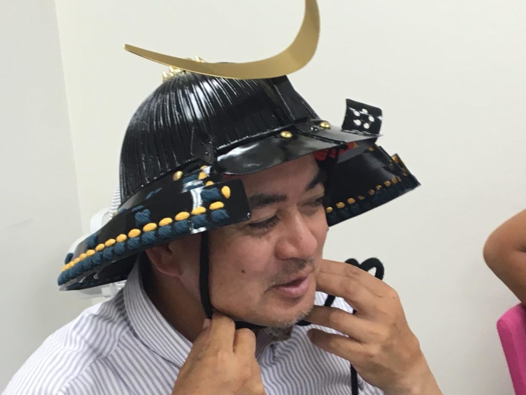 こんな事業なので、やはり実物を見て、触って、楽しんでもらいたいと思いましたので、子供用ですが伊達政宗の兜を持参しました。わざわざお越しくださった皆様に、少しでも楽しいおもひでにしてほしいと思い、被って楽しんでもらいました。