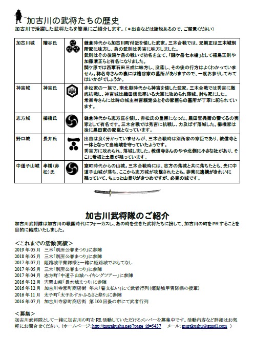 加古川武将隊は、加古川(将来的に東播)の戦国にフォーカスし、地域の歴史をPR、「地元を好きになるきっかけ作り」を目指しています。