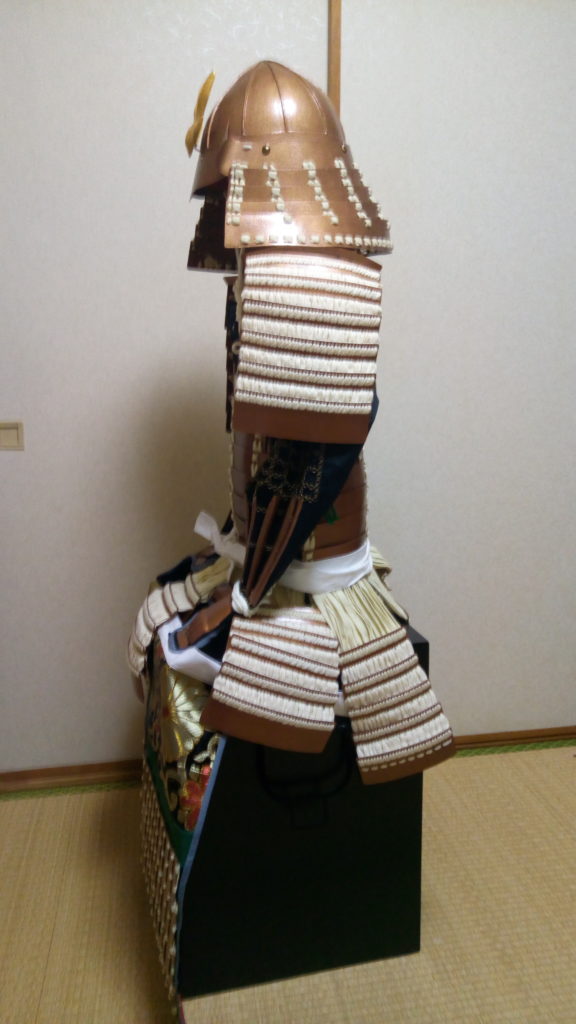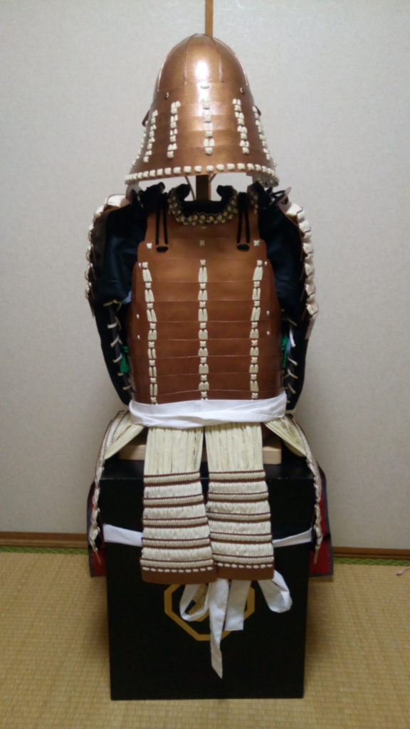 なお、板物は悩んだ挙句、卯の花色を強調するためにも、錆地色もどきを想定したブロンズ色にしました。袖や草摺りは毛引き威しにしましたが、胴や𩊱は素掛けにしました。