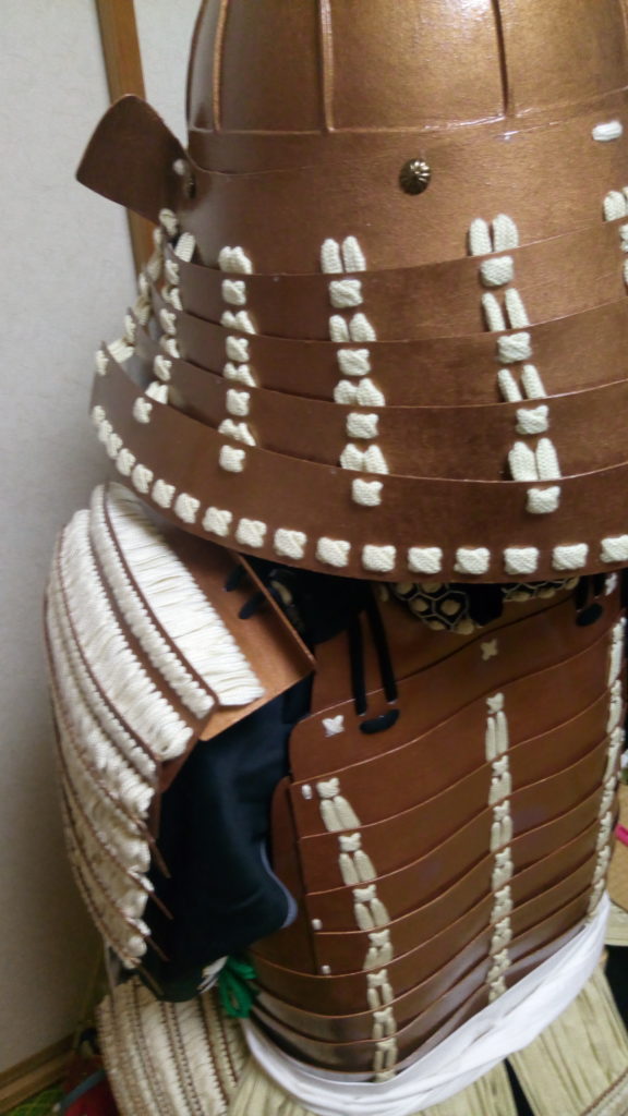 卯の花のように白を基調とした紐を使って、威された鎧という意味。「威す(おどす)」とは甲冑の部品を紐でつなぐ作業のこと。全体に卯の花色の威し糸を使って、制作しました。