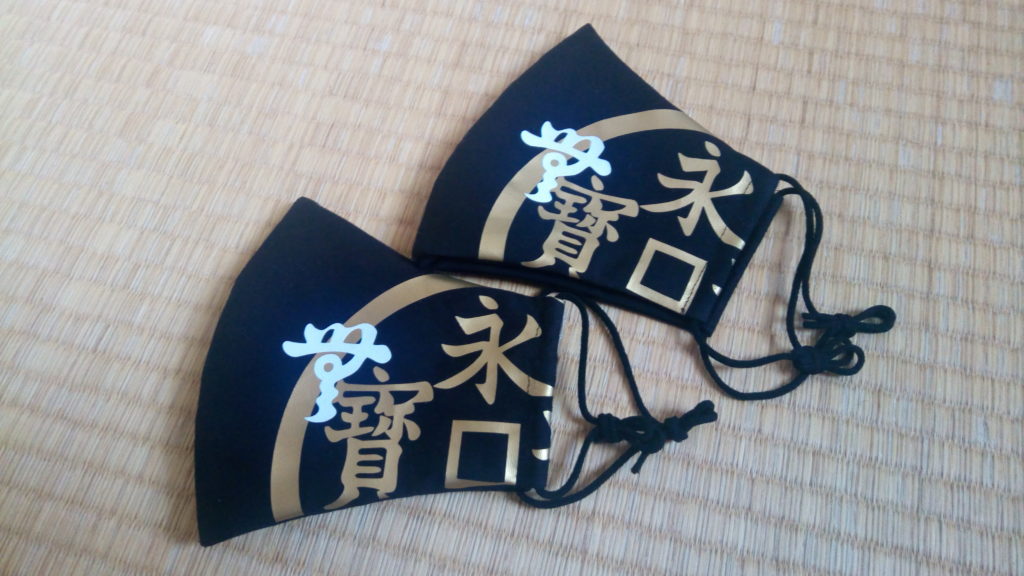 黒地ベースに、永楽通宝と「無」の紋をあしらったデザインです。