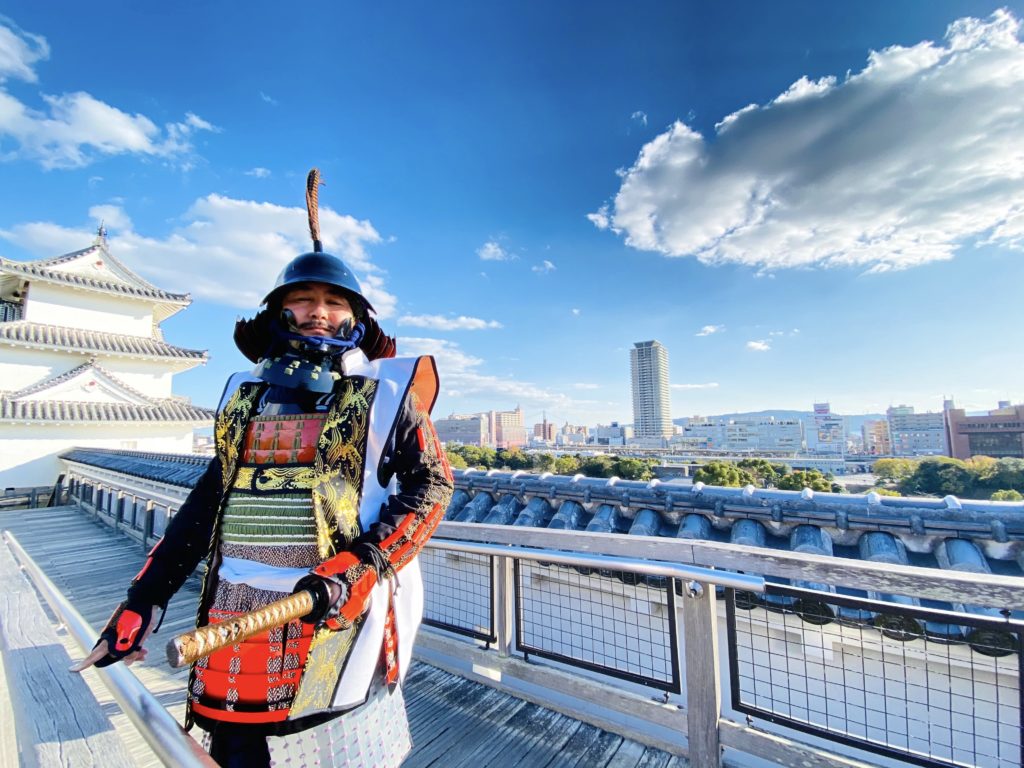 白壁と青空、そして甲冑の色のコントラストもきれいで、非常に目の引く、映える写真が撮影できました。