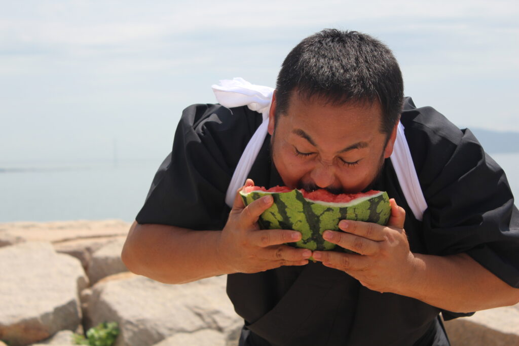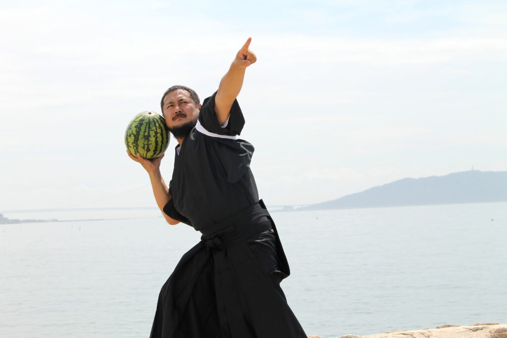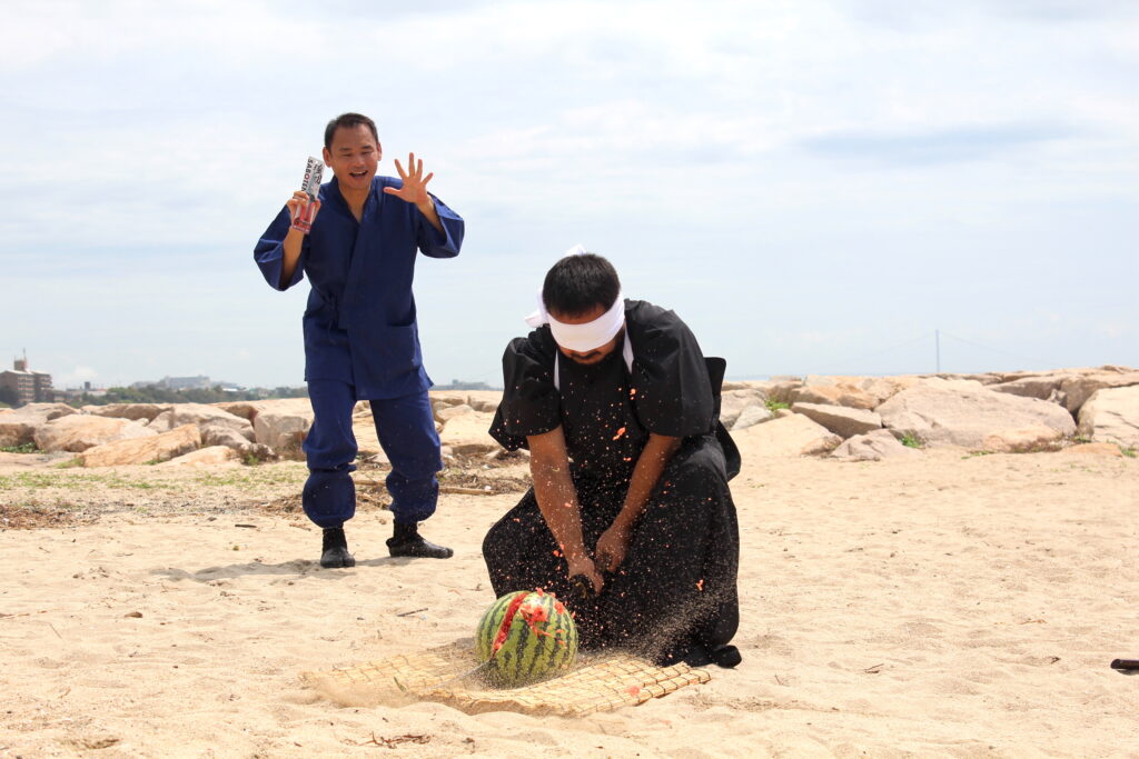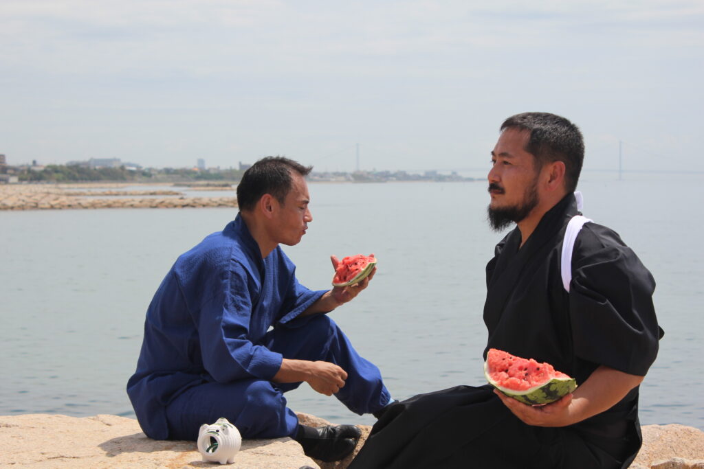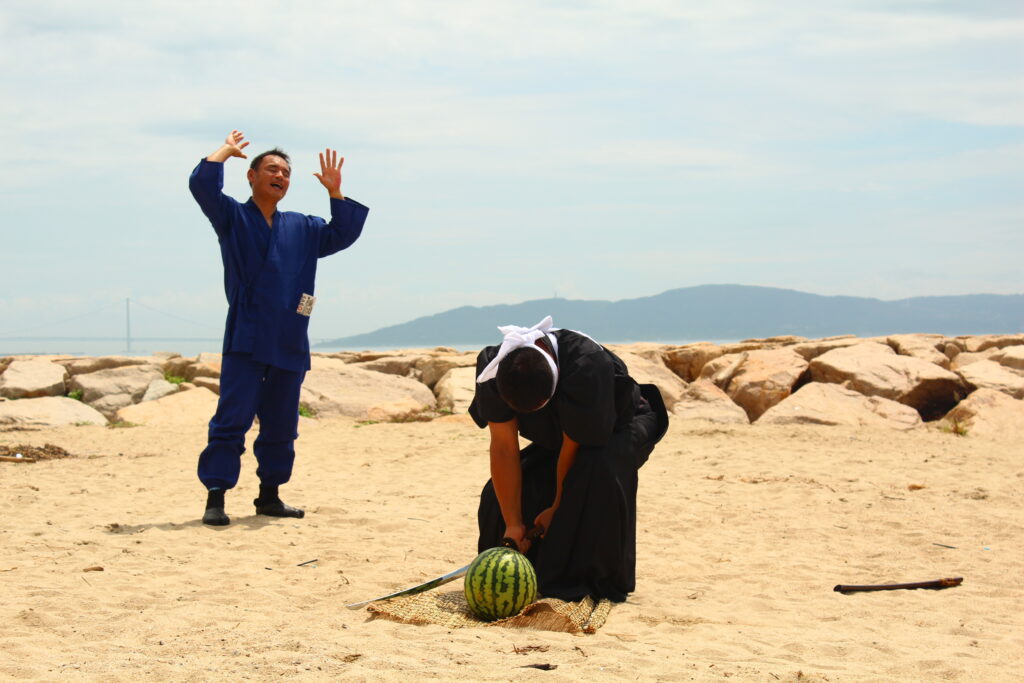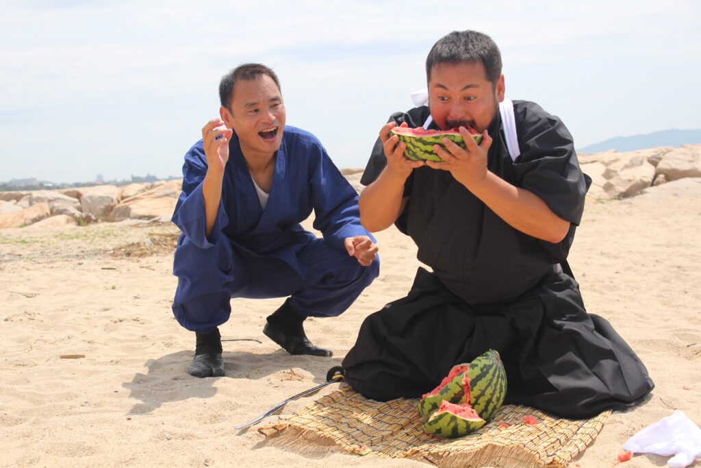 撮影には良いやや曇り空。しかし、湿度や暑さは相当なもので、浜辺で着物姿の侍たちは汗ダクダクになりながらも撮影を必死に頑張っていただきました。