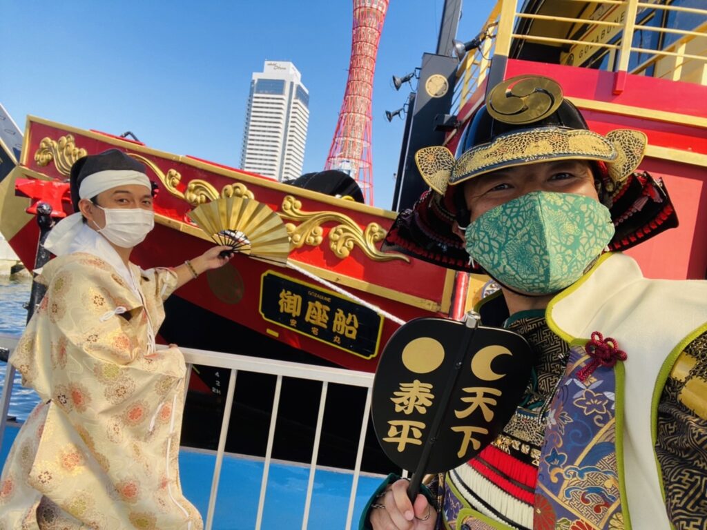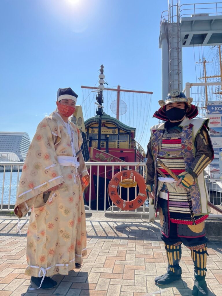 今回は、色々威しの派手な殿様甲冑と金襴鎧直垂姿で、出港時のお見送りと帰港時のお出迎えをさせていただきました。