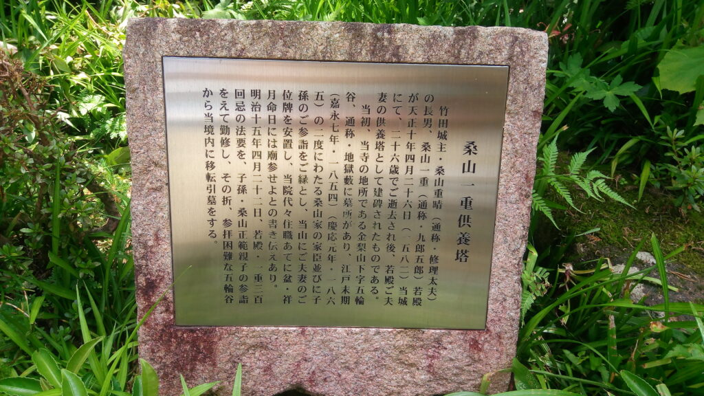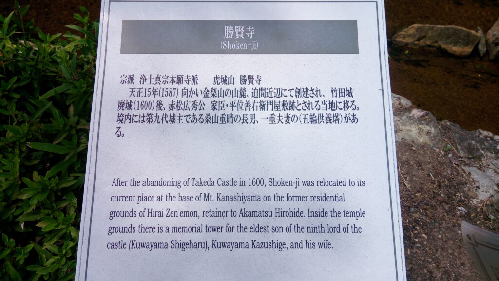 Tweet 浄土真宗本願寺派 虎城山 勝賢寺 (現地看板より)浄土真宗本願寺派 虎城山 勝賢寺。天正15年(1587年)に向かいの金梨山の迫間近辺にて建立され、竹田城廃城(1600年)後に、赤松広秀公家臣、平位善右衛門屋敷跡とされる当地に移る。境内には第9代城主とされる桑山重治の長男、一重夫妻の供養塔がある。 Tweet 関連 2022-01-05