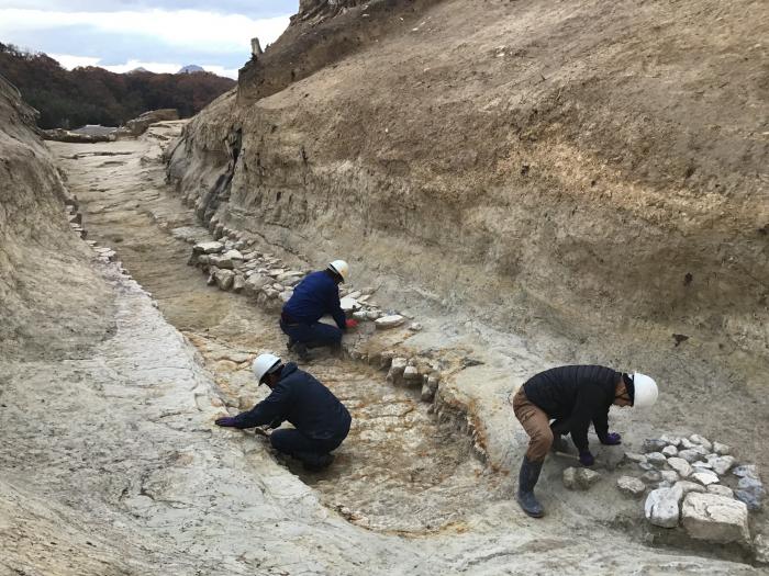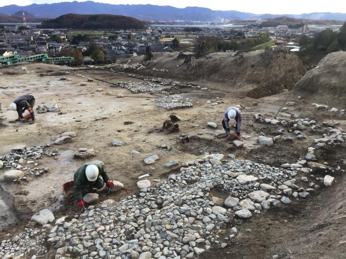 城跡は丘陵頂部に東西2つの大きな曲輪があり、本年8月開催の現地説明会では、曲輪2を中心に、16世紀末頃の調査成果について公開いたしました。今回は、さらに調査が進み、主郭と考えられる曲輪1と、曲輪2についてもより前回の公開時よりも古い段階の調査成果について公開いたします。
