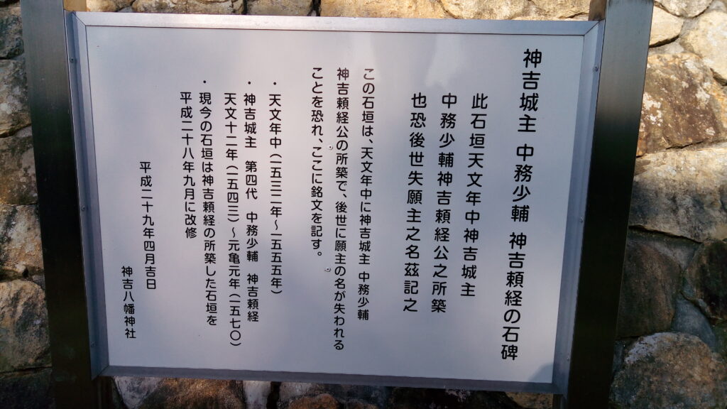 戦国という観点では、当神吉を治めていた神吉氏の第4代当主、神吉中務少輔頼経公が社殿の建つ基礎となる石垣を寄進されたと伝わるようです。