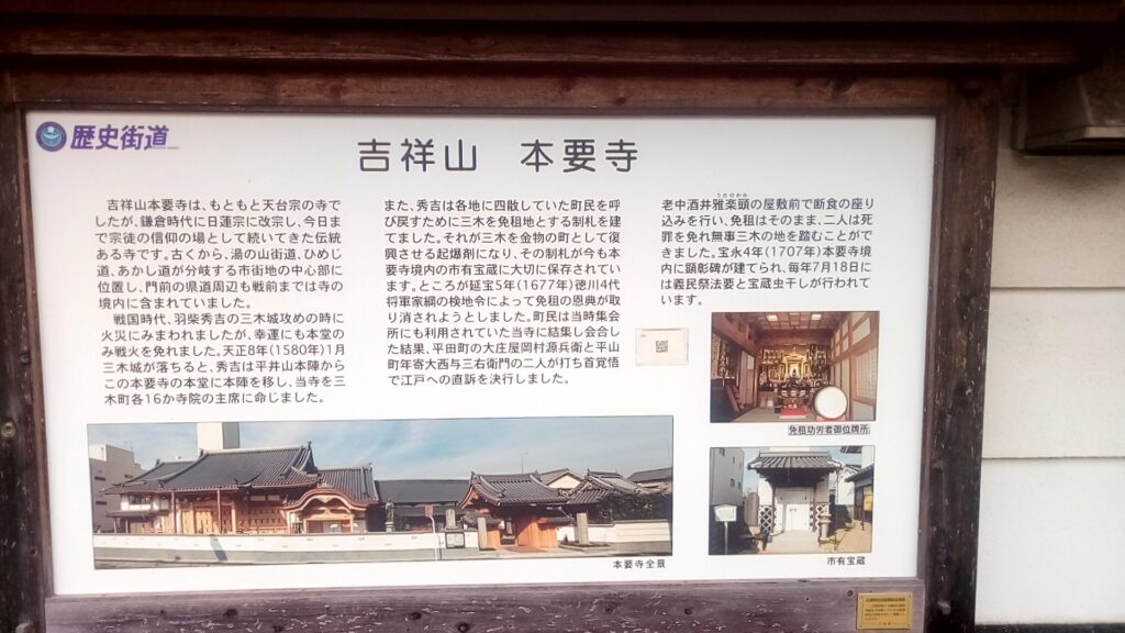 Tweet 三木合戦後、秀吉が本陣を置いた本要寺 本要寺は、三木合戦終了後の秀吉の陣所となりました。ここで、三木城主別所長治ほかの首実検も行われたと伝わります。 また、秀吉は三木の地を治めるために、民に対して租税免税を行いました。それが、以後この地のある種の特権となり、秀吉亡き後、徳川幕府においても免税が続いたという稀有な町になりました。それにまつわる秀吉が出した免税の高札が保存されています。 Tweet 関連 2022-01-17