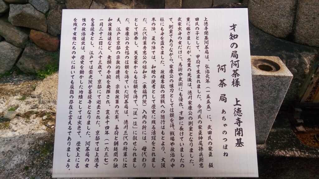 Tweet 京都五条、上徳寺 阿茶の局は徳川家康の側室。家康の若いころから戦場に同行している。大坂の陣では、常高院・大蔵卿局と会見して和議の成立に尽力した。 上徳寺は、阿茶局と息女の泰栄院の菩提を弔うために建立されたともいわれる。子授けや安産にもご利益のあるお寺です。 Tweet 関連 2022-01-18