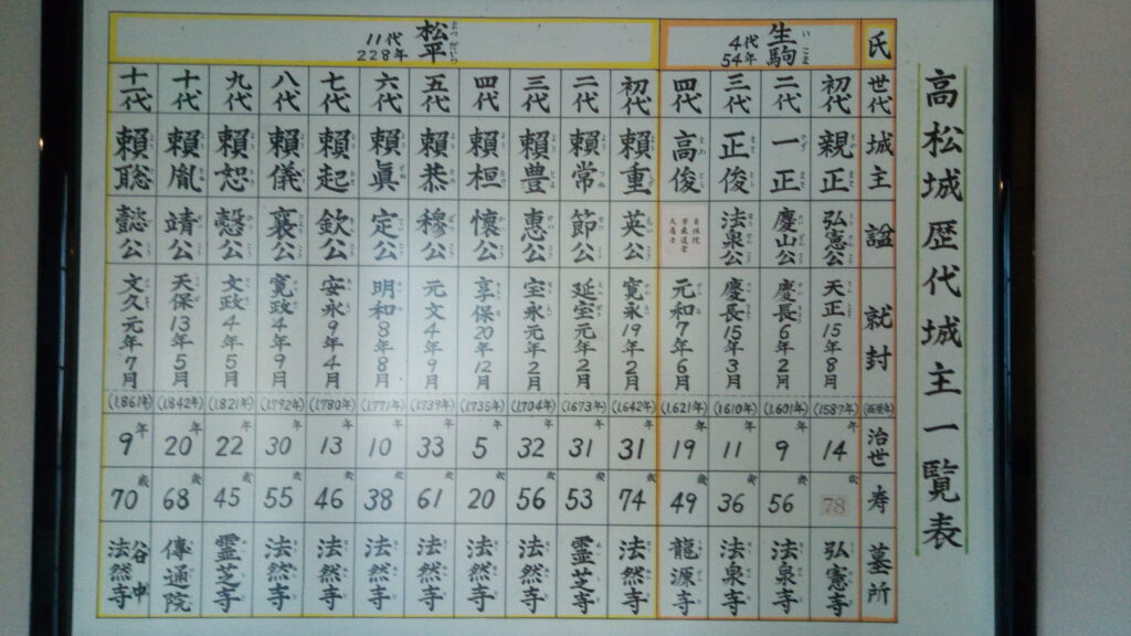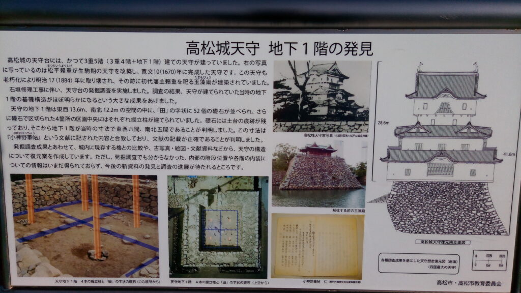 高松城は、豊臣秀吉の四国制圧の後、1587年(天正15年)讃岐1国の領主となった生駒親正によって、「野原」と呼ばれた港町に築かれた。現在見られる遺構は、江戸初期に徳川光圀の兄で常陸国から12万石で高松に移封された松平頼重によって改修されたものである。