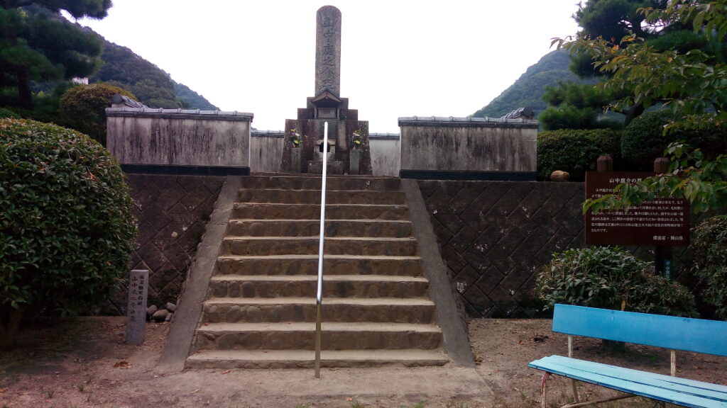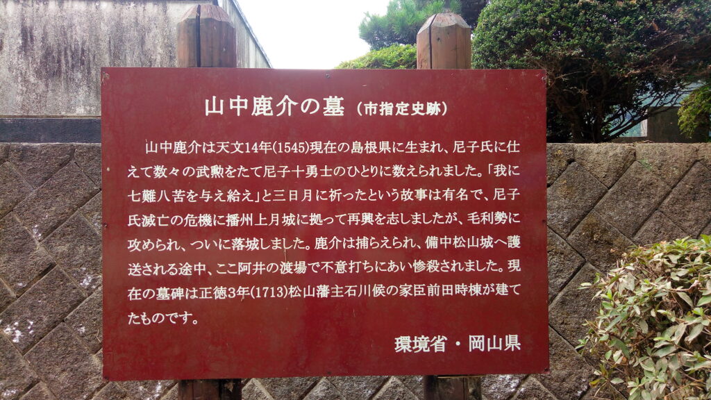 しかし、その願いは届かず。織田家と手を組み、播磨上月城で再興の夢を見るも、荒木村重や三木別所の離反が相次ぎ、見捨てられた形となった尼子勝久は自害、山中鹿之助は囚われて毛利領へ護送される途中、備中高梁の阿井の渡しで切られたと伝わります。その場所に墓所があります。