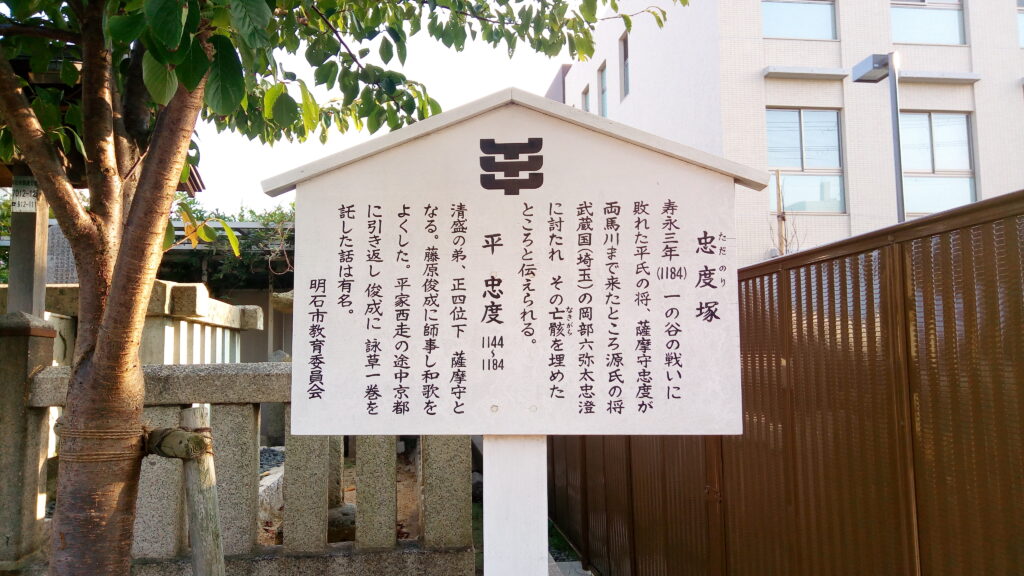 Tweet 平家の栄枯盛衰 (案内板より)寿永3年(1184年)、一の谷の戦いで敗れた平氏の将、薩摩守忠度(ただのり)が両馬川まで来たところ、源氏の将、武蔵国の岡部六弥太忠澄に討たれ、その亡骸を埋めたところと伝わる。 Tweet 関連 2022-01-24
