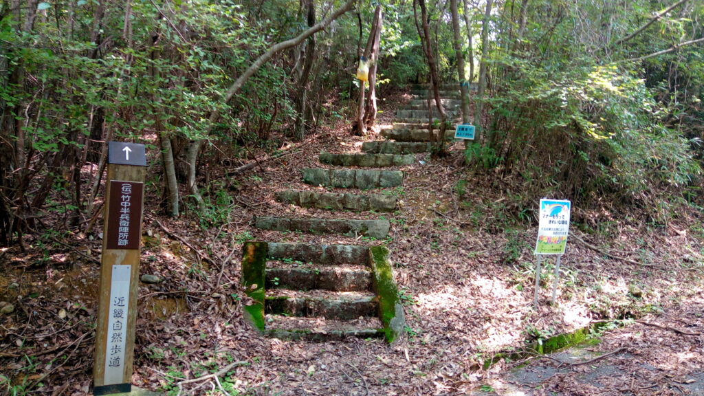 平井山陣所の麓の駐車場から徒歩でいったん竹中半兵衛墓所方面に下り、右折、神社を抜けた先に、登山口の鳥居が建っている。そこから進み、大きな池を渡り、車道を超えてさらに登っていくとたどり着きます。