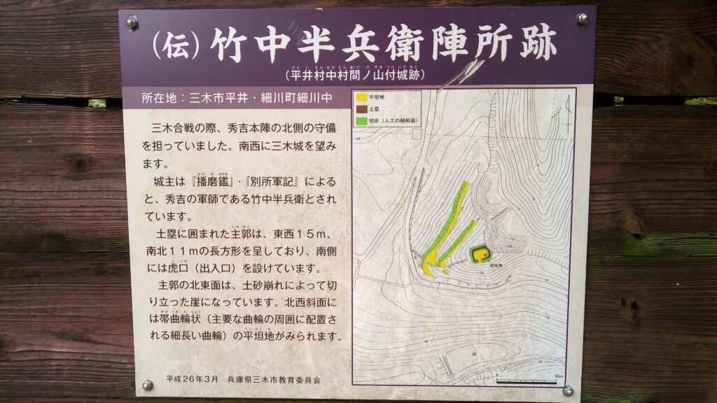 三木合戦時、羽柴秀吉の軍師であった竹中半兵衛重治は織田信忠が築城し、秀吉に任せた平井山の陣所の北側を陣所としていた。