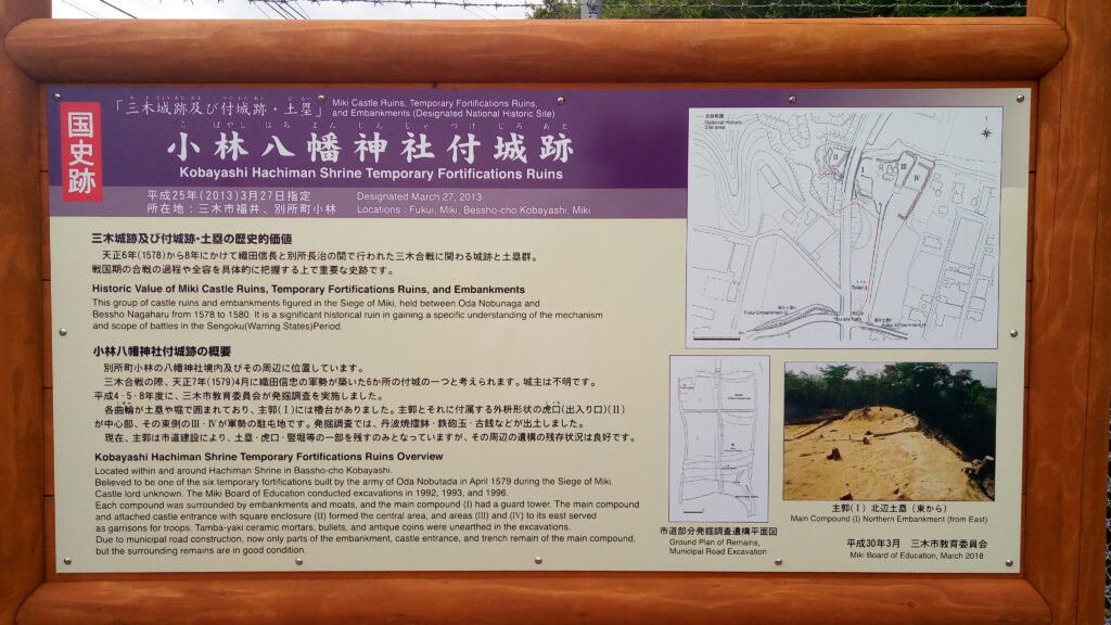 Tweet 城将不明 三木合戦の終盤に築かれた付城。守将は不明。発掘調査資料では、神社に入って左手にも遺構があるようだが、枯れ葉ぎっしりでほとんどわからない。しかし、右手は広い敷地になっており、低めの土塁囲みが確認できます。 神社入口には数台車を停められる空き地があり、大きな看板も立っています。 Tweet 関連 2022-02-07
