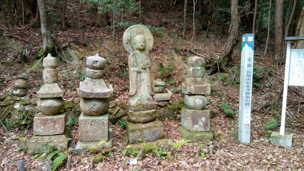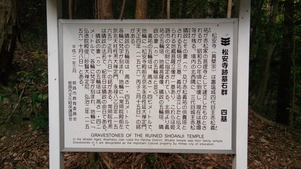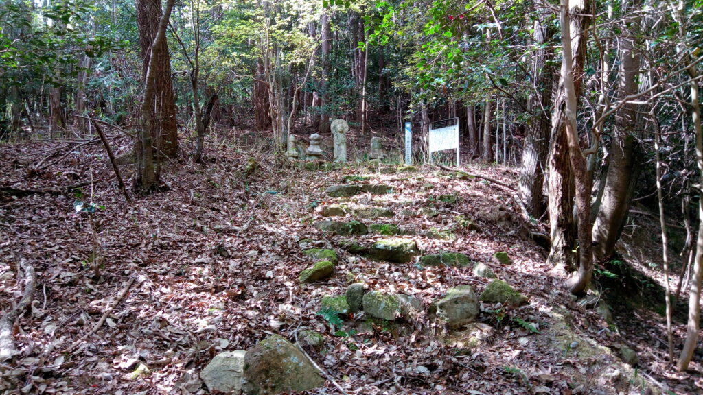 Tweet 現在は廃寺 松安寺は置塩城主赤松家の4代目義祐が菩提寺として建立したそうです。現在は廃寺となっていて、山に戻りつつありますが、境内があったであろう広い削平地や石の階段が残っています。奥に義祐、晴政、晴政の妻の五輪塔が並んでいます。 往時は、川向いに壮大な置塩城がそびえ、ここに広い菩提寺と集落があったんだろうなと想像します。 Tweet 関連 2022-02-15
