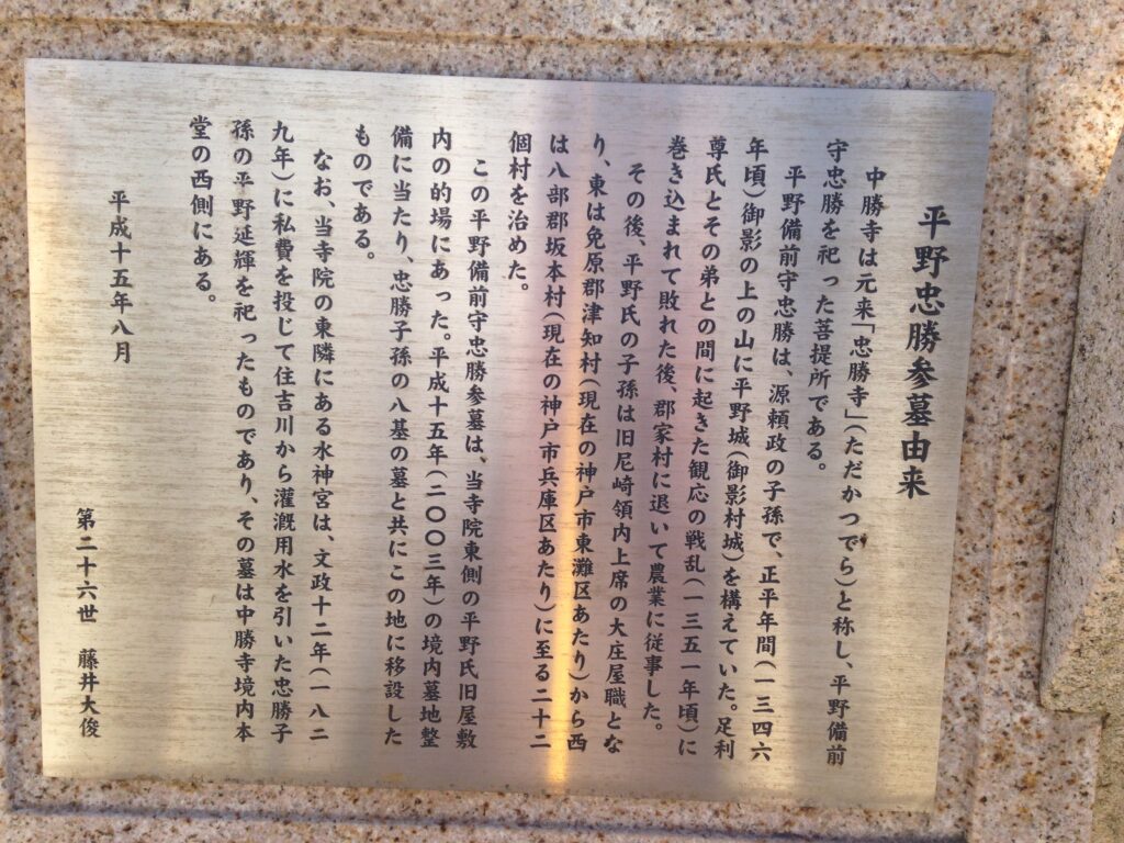 Tweet 平野忠勝の墓所 衣笠氏の端(寺内看板より抜粋)平野忠勝は源頼政の子孫。御影村城(平野城)を築いて当地を領有していた。足利尊氏兄弟の争い「観応の乱」に巻き込まれ、敗れたために帰農したという。 Tweet 関連 2022-03-11