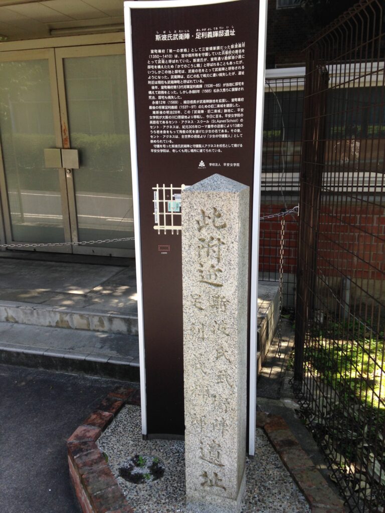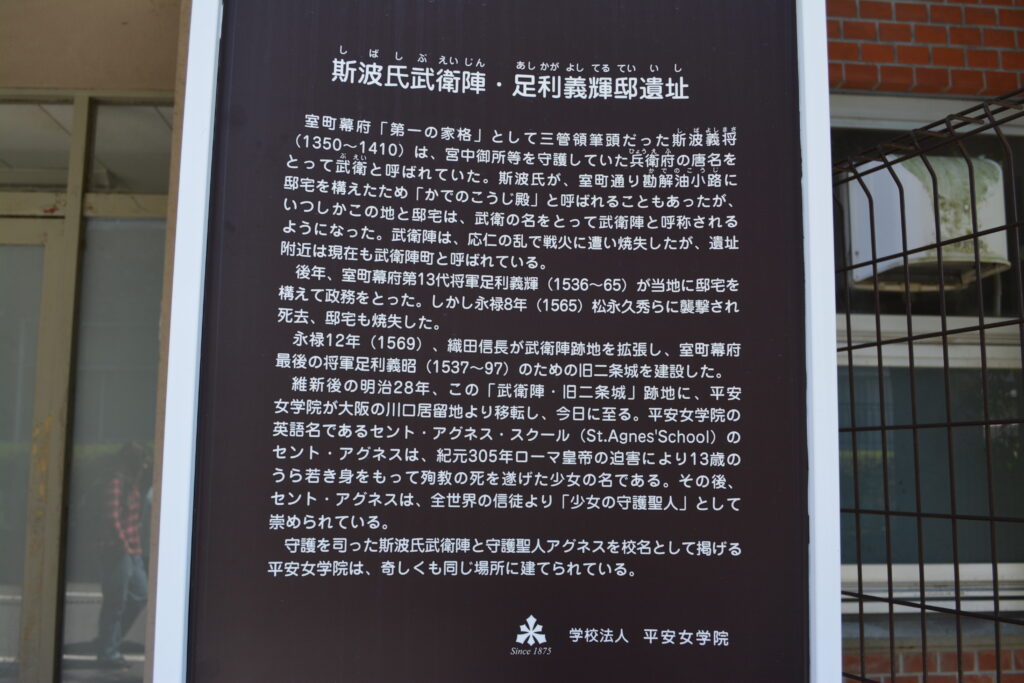 また、ここは13代将軍足利義輝が居を構えた、三好義継・松永久秀らに襲撃された際に、剣の達人であった義輝は畳に数本の刀を立て並べ、刃がおれては次の刀で戦うなど、果敢に奮戦したという。しかし、最期は落命した。