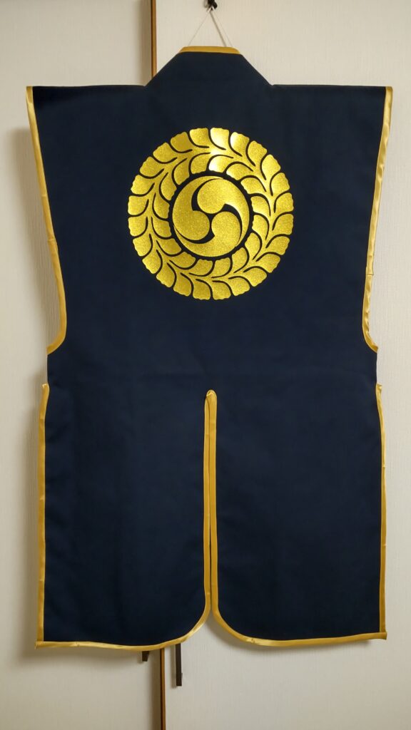 背中には大きく金色(ラメあり)の家紋が紺地とのコントラストで映えます。