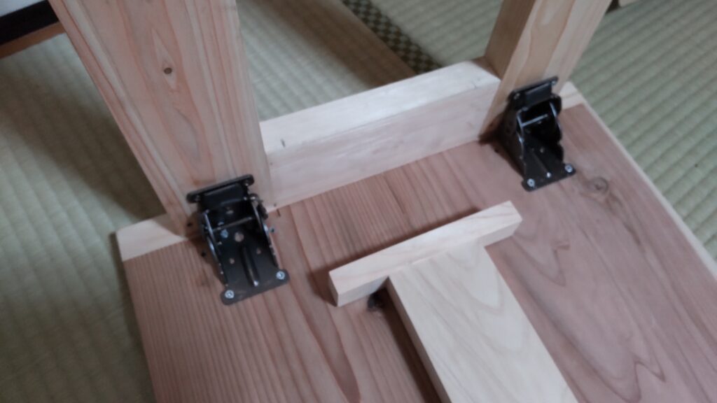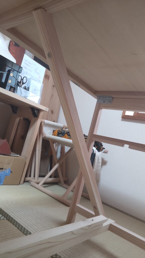 足の一番下の凹みにつっかえ棒を真横と斜め上の2つはめ込んで足を固定します。