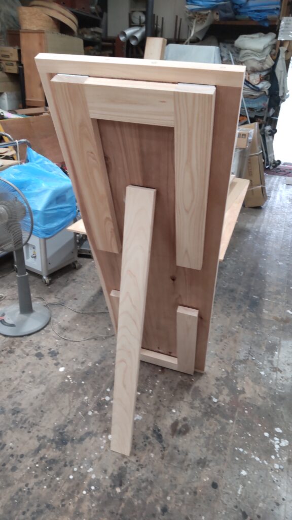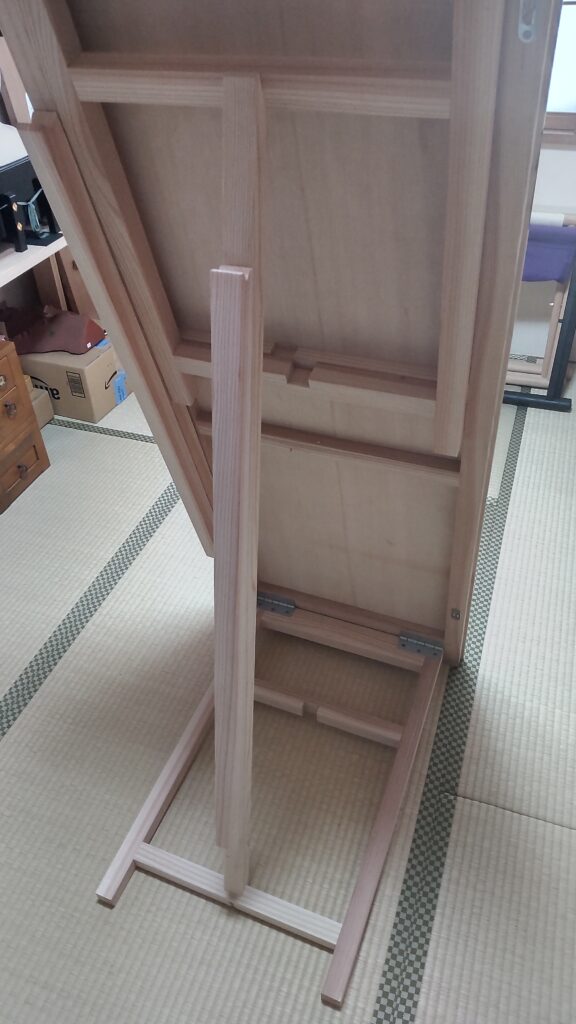 楯として使い場合は、下側の足を広げます。そこに側面に付随している突っ張り棒を凹んだくぼみに合わせて、上下を引っ掛けて固定することで立たせます。