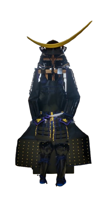 黒色を基調とし、桃形兜に三日月の前立てのシンプルな甲冑。